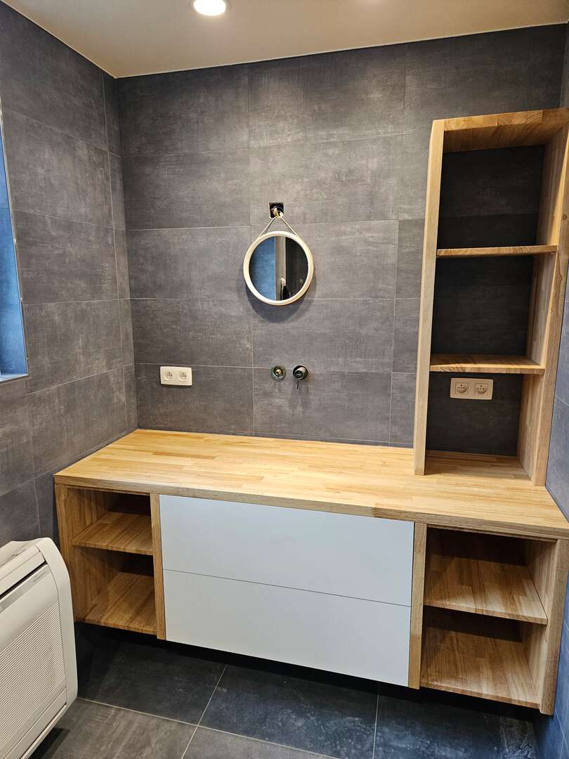 Zwevend badkamer meubel. Combinatie van plaatmateriaal en massief hout met Tip-on lades van Blum. Massief hout afgewerkt met matte vernis.